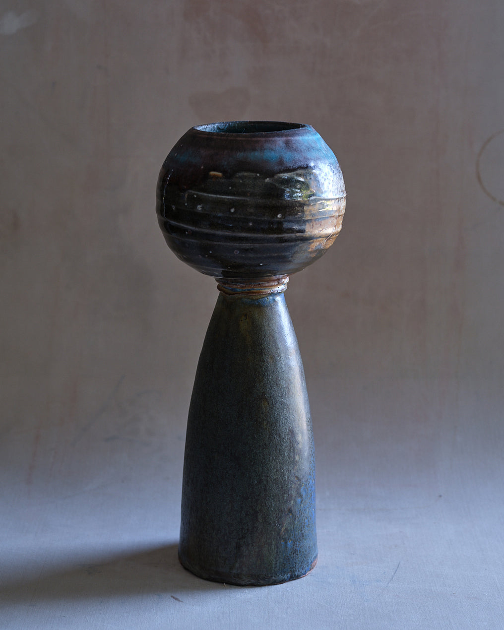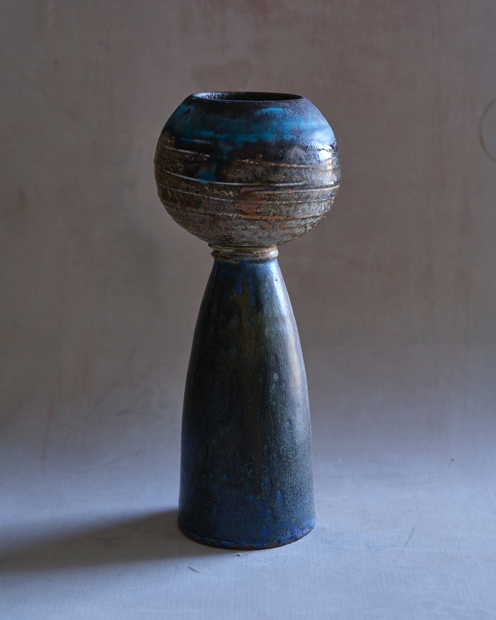 Wheel Thrown Stoneware Ikebana Vase with Porcelain Slip Textured Top Shino & Strontium Blue Glaze with Wood & Soda Ash
