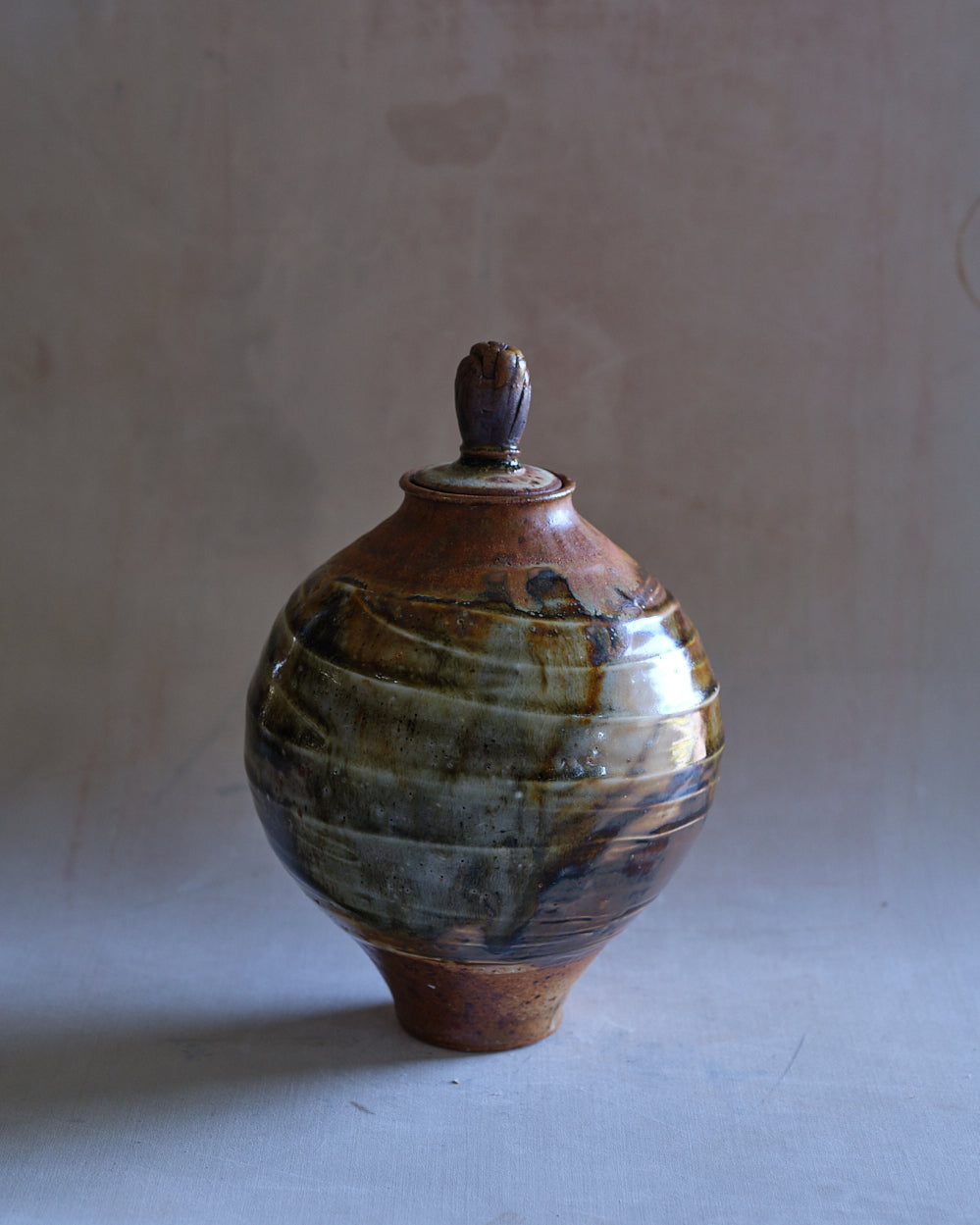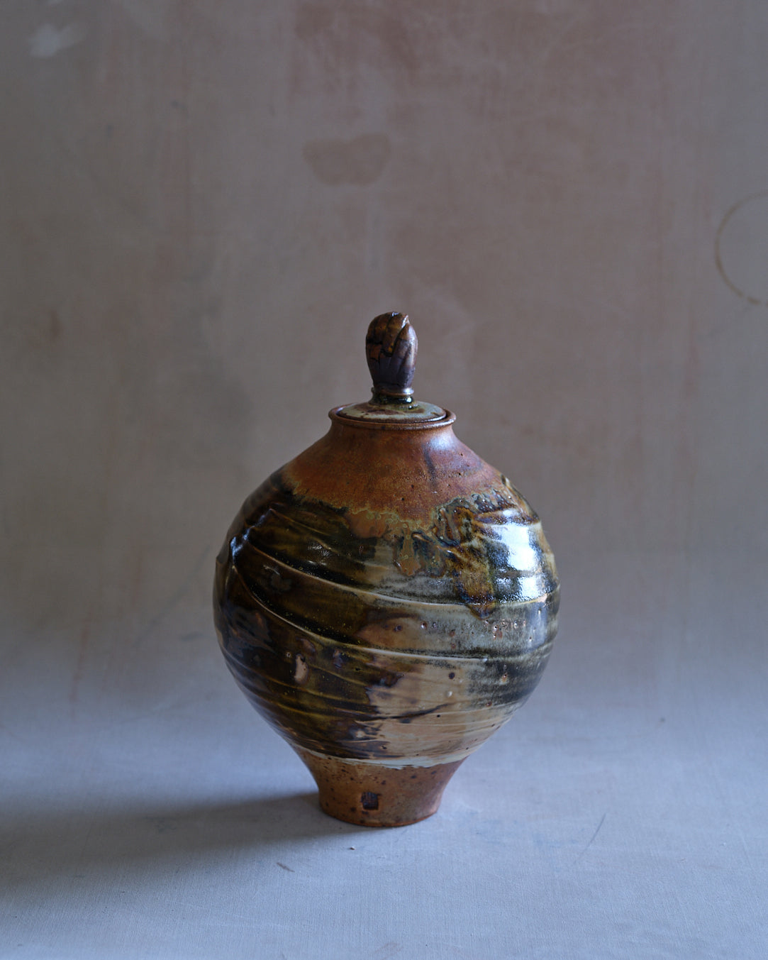 Wheel Thrown Stoneware Urn with Porcelain Slip Textured Body Shino, Tea Dust & Burkes Orange Glaze with Wood & Soda Ash