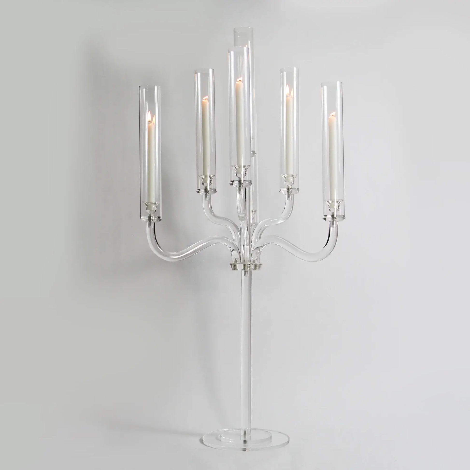 Sculptural elegance meets modern design in this stunning 7-arm candelabra. Crafted from thick, crystal-clear acrylic, its robust structure offers a contemporary twist on classic form, creating a dazzling play of light and reflections. Each arm gracefully extends to cradle a; slender glass chimney, enhancing the glow of candlelight while protecting the flame. Perfect as a dramatic centerpiece for dining tables and mantels or event décor, this candelabra fuses durability with sophisticated style, bringing a touch of luminous glamour to any setting.